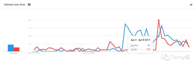 可见在4月份的电视报道之后,两者都开始持续走低。红色的 Kyash 在4月份接受了电视台的采访,开始爬升。蓝色的 Paymo 在1月份就做了一个小高潮,是因为发布了电视广告。